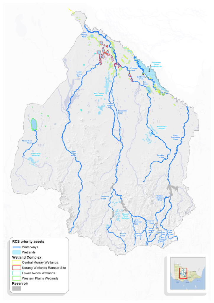| Increased protection and improved management of 20,000 ha of priority RCS wetland assets, by 2027 | CMA, DELWP, Parks Vic, Rural Water Corporations |